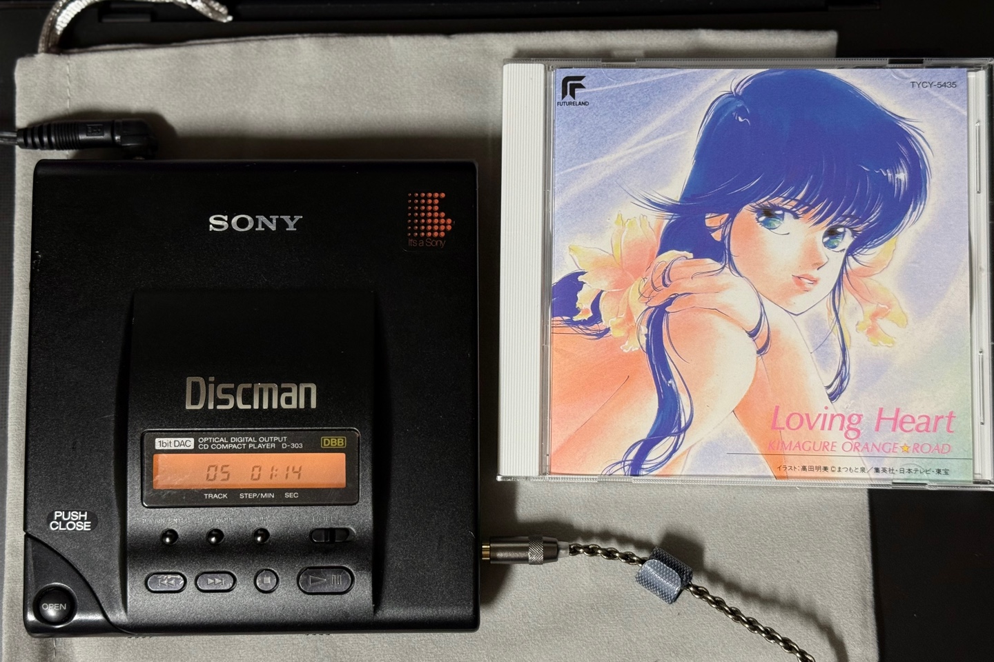 이 녀석은 ESP 기능도 없는 주제에 AA 배터리 2개로 불과 3.5시간 연속 재생이라는 짧은 재생시간을 가지고 있기에 역시 9V DC 어댑터를 따로 구매했다. 이번에도 역시 그 시대에 어울리는 음반 중 하나인 오렌지로드 Loving Heart를 들어본다. D-321도 그렇지만 이 녀석도 볼륨 MIN에서도 음악 소리가 이어폰으로 들리는데, MIN 볼륨에서 나오는 음악 소리는 D-321보다 좀 더 크다. 하지만 D-321에 비해서는 화이트 노이즈가 잘 안 들리는 점은 역시 더 고급 기기라는 느낌이다. D-303이 D-321보다 좀 더 힘 있는 소리를 들려주기 때문에 좀 더 좋게 들린다. 이 녀석 역시 재생 시 정보창에 주황색 불빛이 들어오는데 사진에서도 뚜렷하게 보일 정도로 밝게 들어와서 역시나 감성을 자극한다.